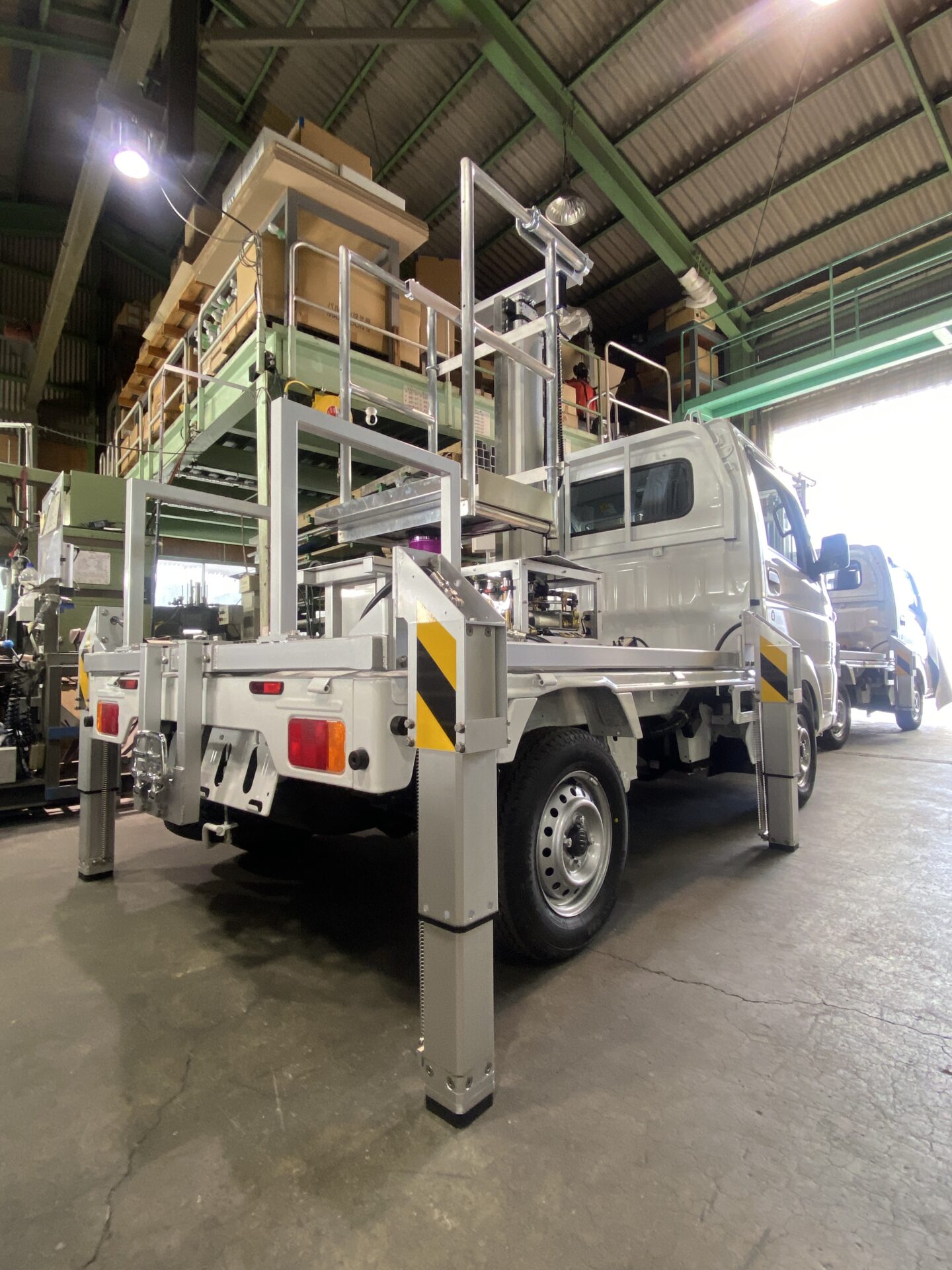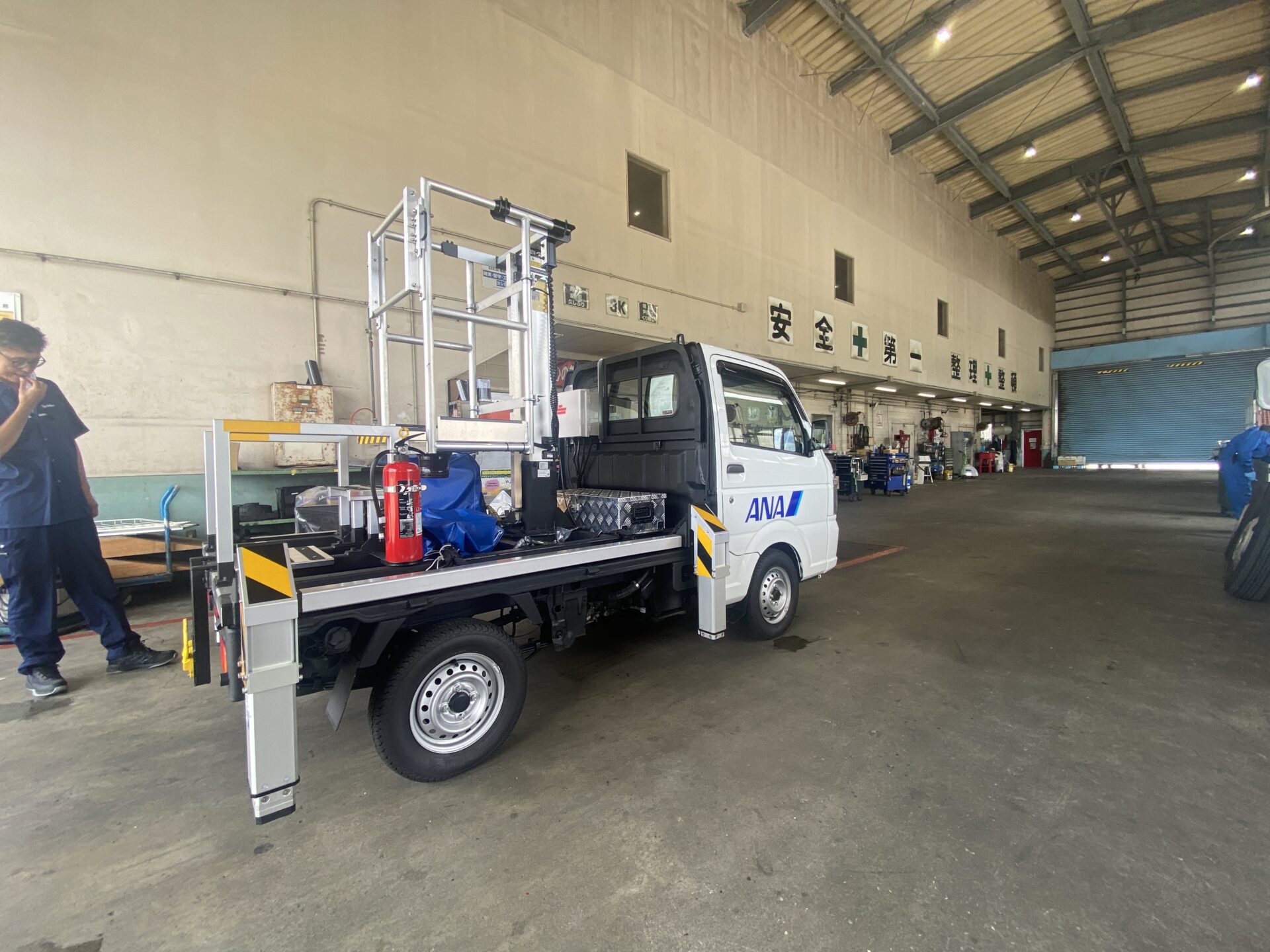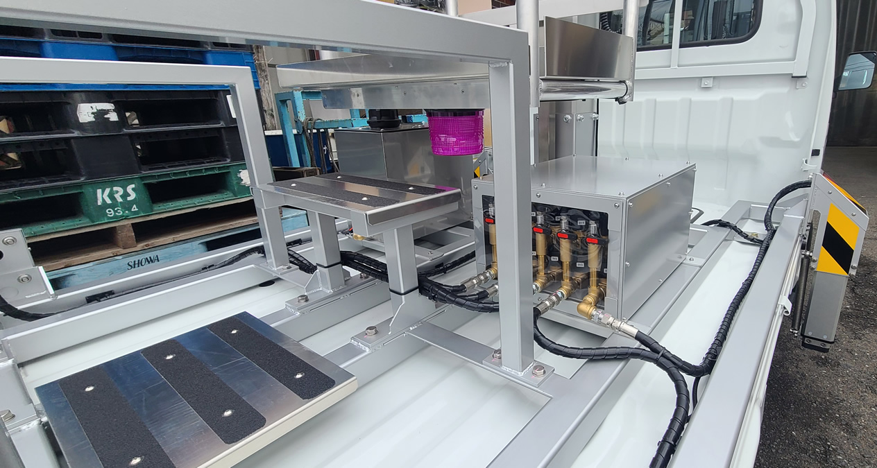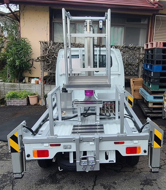 軽自動車ベースのマーシャリングカーに「水圧昇降リフト」と「世界初の水圧アウトリガー」を搭駐。