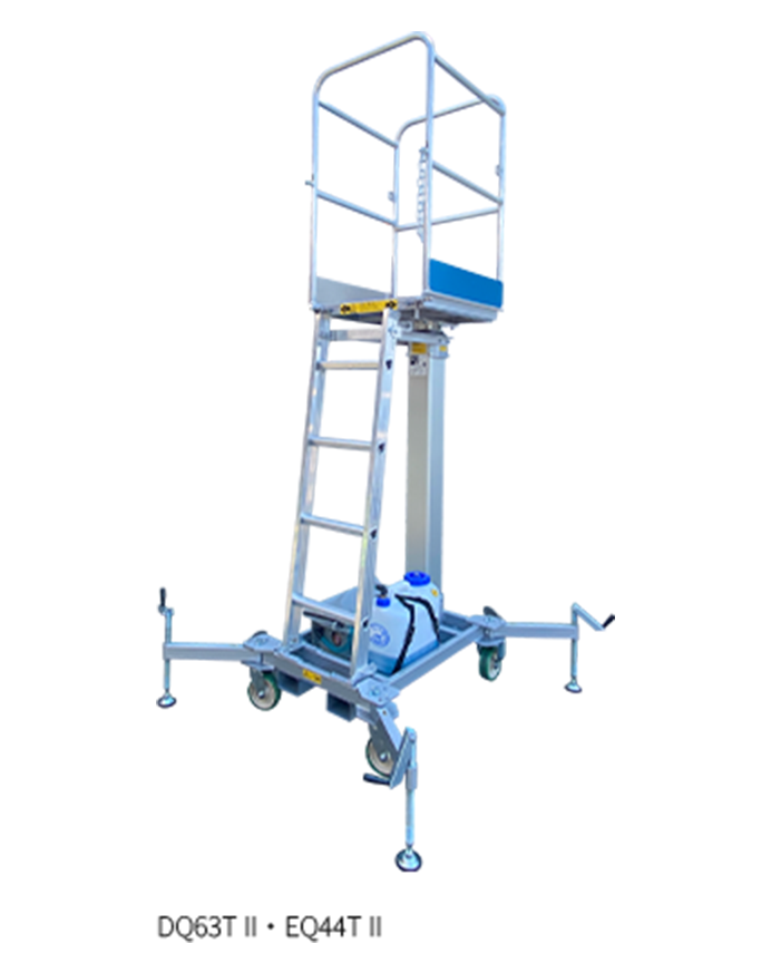 アクアデッキ(水圧式高所作業台)は水圧で昇降するテレスコピック高剛性アルミポールに作業員が乗るステージを取り付けた高所作業台です。乗員は脚立に比べて安全に作業できます。